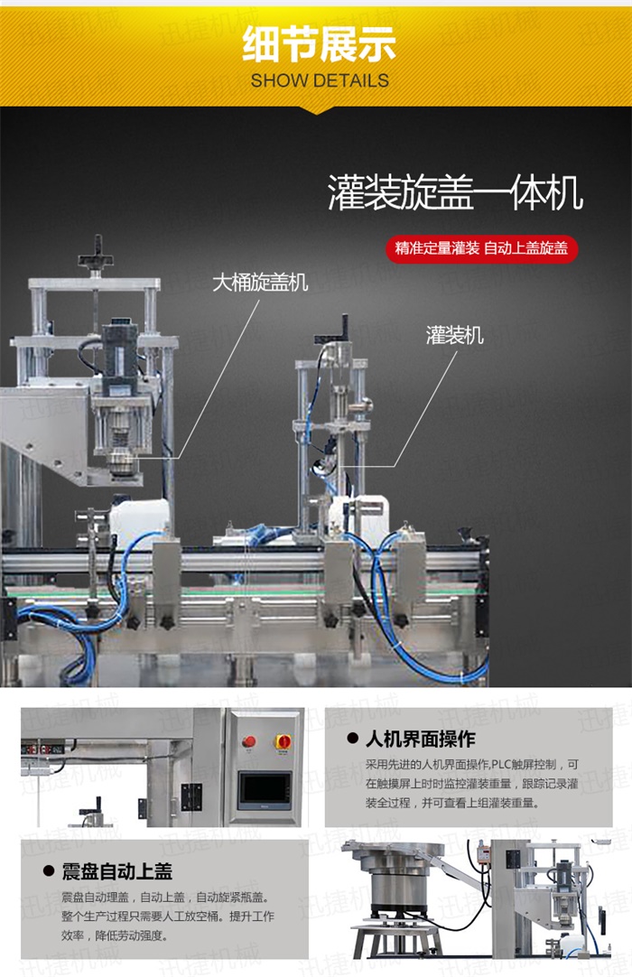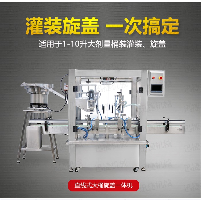 特點:定量灌裝,和瓶蓋旋蓋,在一臺機器上完成。具有占地空間小,自動化程度高特點工作流程:液體灌裝頭自動定位定量灌裝,機器灌裝完成1-10升的灌裝,隨即進(jìn)入下一個工位,震盤自動理蓋,自動上蓋,自動旋緊瓶蓋。整個生產(chǎn)過程只需要人工放空桶。提升工作效率,降低勞動強度。