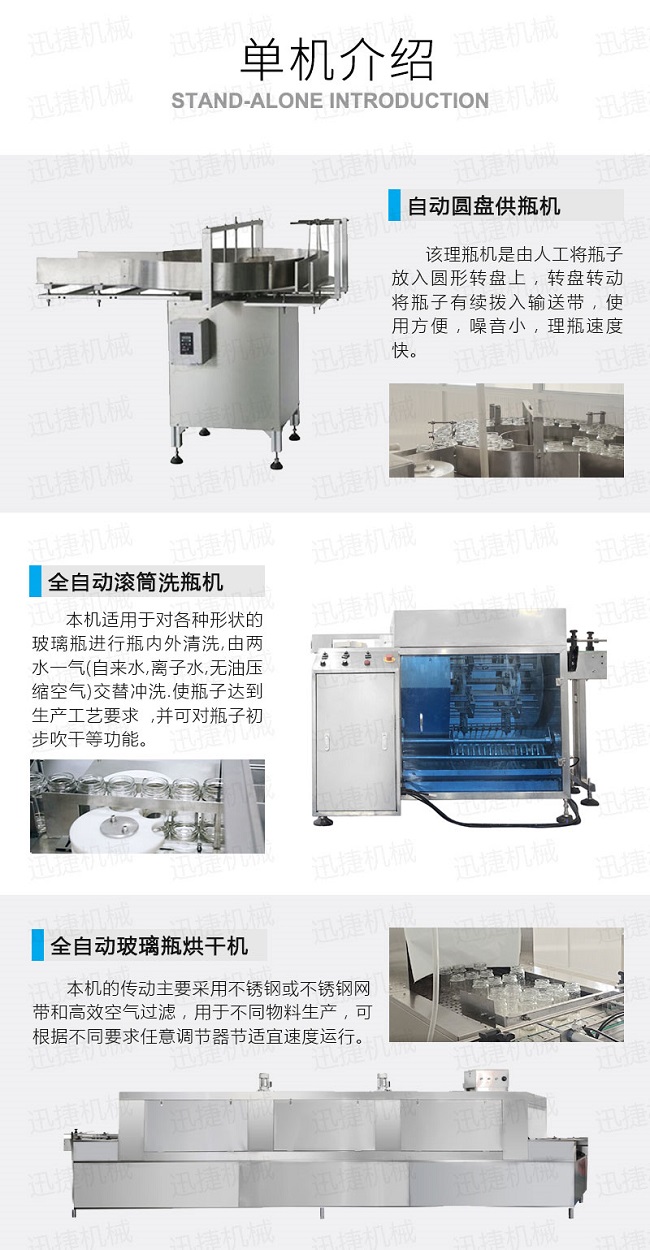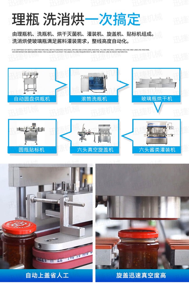 自動供瓶機+全自動滾筒洗瓶機+自動六米烘干機+自動收瓶機+全自動六頭灌裝機自動灌裝+全自動提蓋機自動理蓋、提蓋、掛蓋+六頭真空旋蓋機同時六個頭真空旋蓋+套標(biāo)機+收縮機+圓瓶貼標(biāo)機+整理平臺;