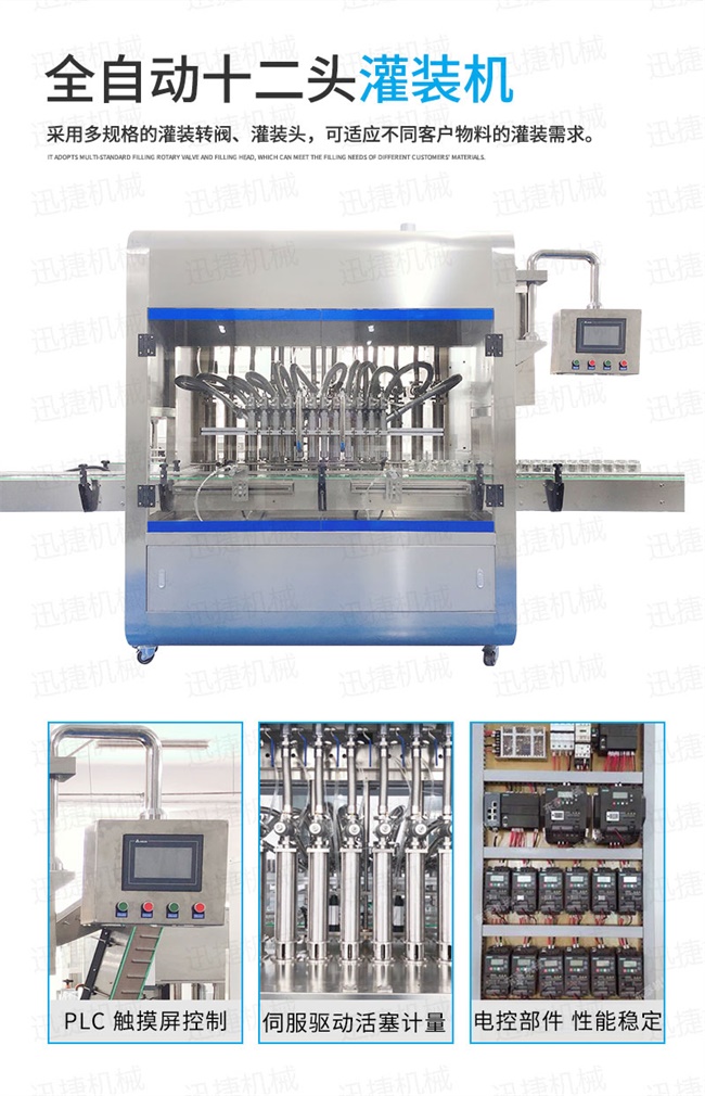 2、灌裝機(jī)以進(jìn)口PLC電腦控制、伺服驅(qū)動(dòng)計(jì)量,全彩色觸摸屏人機(jī)界面,一鍵完成計(jì)量切換確保容量之調(diào)整簡易、快捷、準(zhǔn)確。是任何形式的灌裝機(jī)無法替代的;