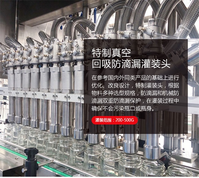 3、灌裝機(jī)采用橫推料的方式,大大縮短了下料斗到灌裝頭的距離,提高了灌裝速度,更重要的是解決了含油量大的物料在灌裝過程中出現(xiàn)的有些瓶油多,有些瓶醬多的灌裝難題,大大提高了灌裝精度。