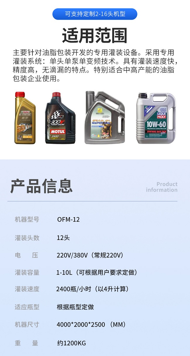 這款全自動十二頭三排潤滑油灌裝機是本公司專為潤滑油廠家研發(fā)的自動化設(shè)備,這款潤滑油灌裝機2-16頭可定制,防起沫防滴漏。主要針對油脂包裝開發(fā)的專用灌裝設(shè)備。采用專用灌裝系統(tǒng):單頭單泵單變頻技術(shù)。具有灌裝速度快,精度高,無滴漏的特點。特別適合中高產(chǎn)能的油脂包裝企業(yè)使用。