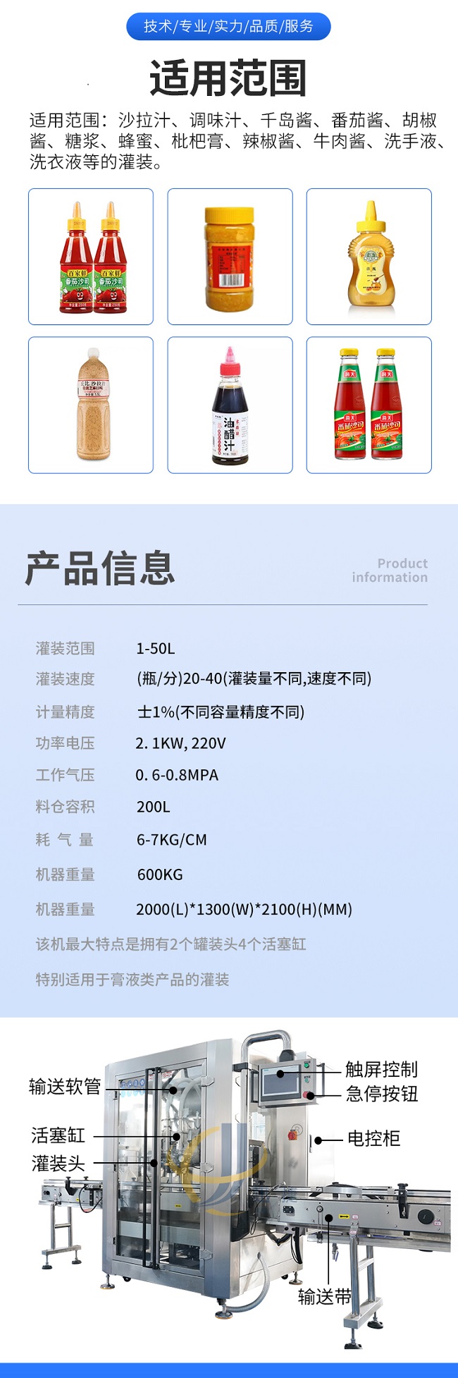 這款全自動(dòng)跟蹤式醬料灌裝機(jī)是本公司研發(fā)的新款專為醬廠研發(fā)的生產(chǎn)設(shè)備,跟蹤式醬料灌裝機(jī)適用范圍:沙拉汁、調(diào)味汁、千島醬、番茄醬、胡椒醬、糖漿、蜂蜜、枇杷膏、辣椒醬、牛肉醬、洗手液、洗衣液等的灌裝。