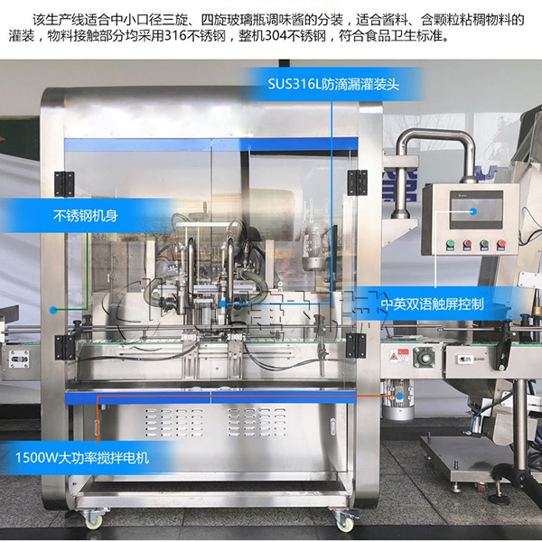 該機為雙頭辣醬灌裝機,配有自動攪拌功能,使物料混合更加均勻 ,有效的解決灌裝誤差大的問題;雙頭辣醬灌裝機輔料添加料可調(diào),精準(zhǔn)方便,提高自動化程度。 雙頭辣醬灌裝機氣動部分均采用知名氣動元件,壽命長,穩(wěn)定。 物料接觸部分采用SUS316L不銹鋼材料制成,符合食品醫(yī)藥安全衛(wèi)生要求。 灌裝閥由氣動閥控制,灌裝精度更高。 這款雙頭辣醬灌裝機幫您解決醬會堵塞的問題