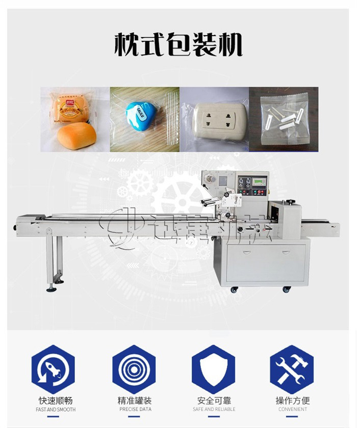 該包裝機(jī)為全自動(dòng)枕式包裝機(jī),適用于各種固型產(chǎn)品的包裝,如食品類(方便面、面包、漢堡、餅干、雪糕、冷凍食品),日用品(肥皂、餐巾紙),五金配件,機(jī)械零件(軸承),橡膠制品(輪胎)等產(chǎn)品的枕式包裝。